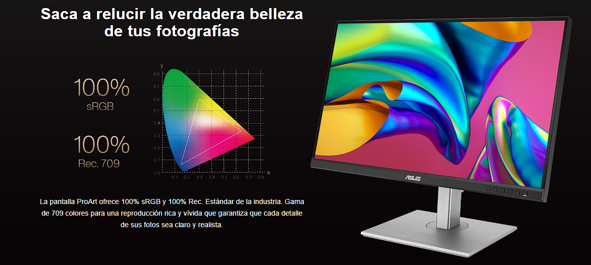 • Estándar de color internacional 100% sRGB y 100% Rec. 709 amplia gama de colores.